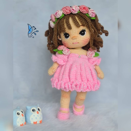 عروسک بافتنی دختر گلپری با لباس صورتی و تاج گل رز