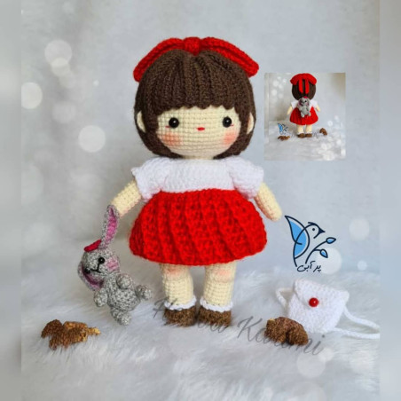 عروسک بافتنی دخترک روبانی یک عروسک دستساز زیبا با دامن قرمز، موهای قهوهای و عروسک خرگوش بامزه